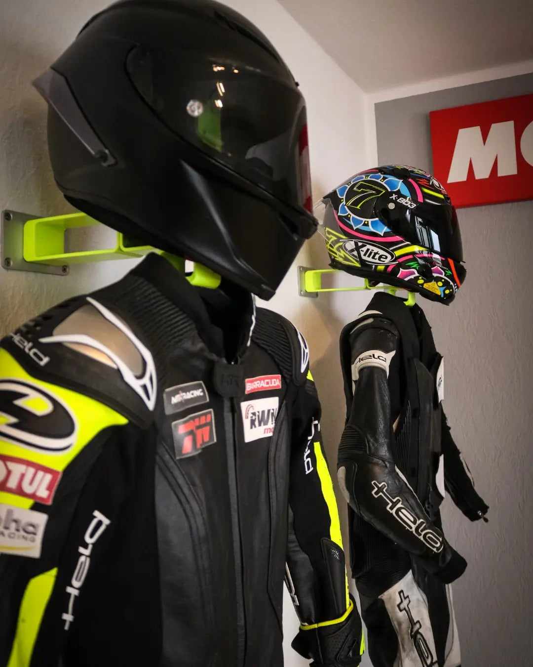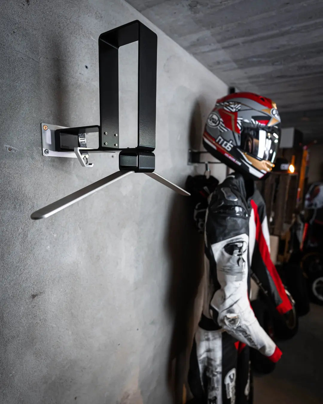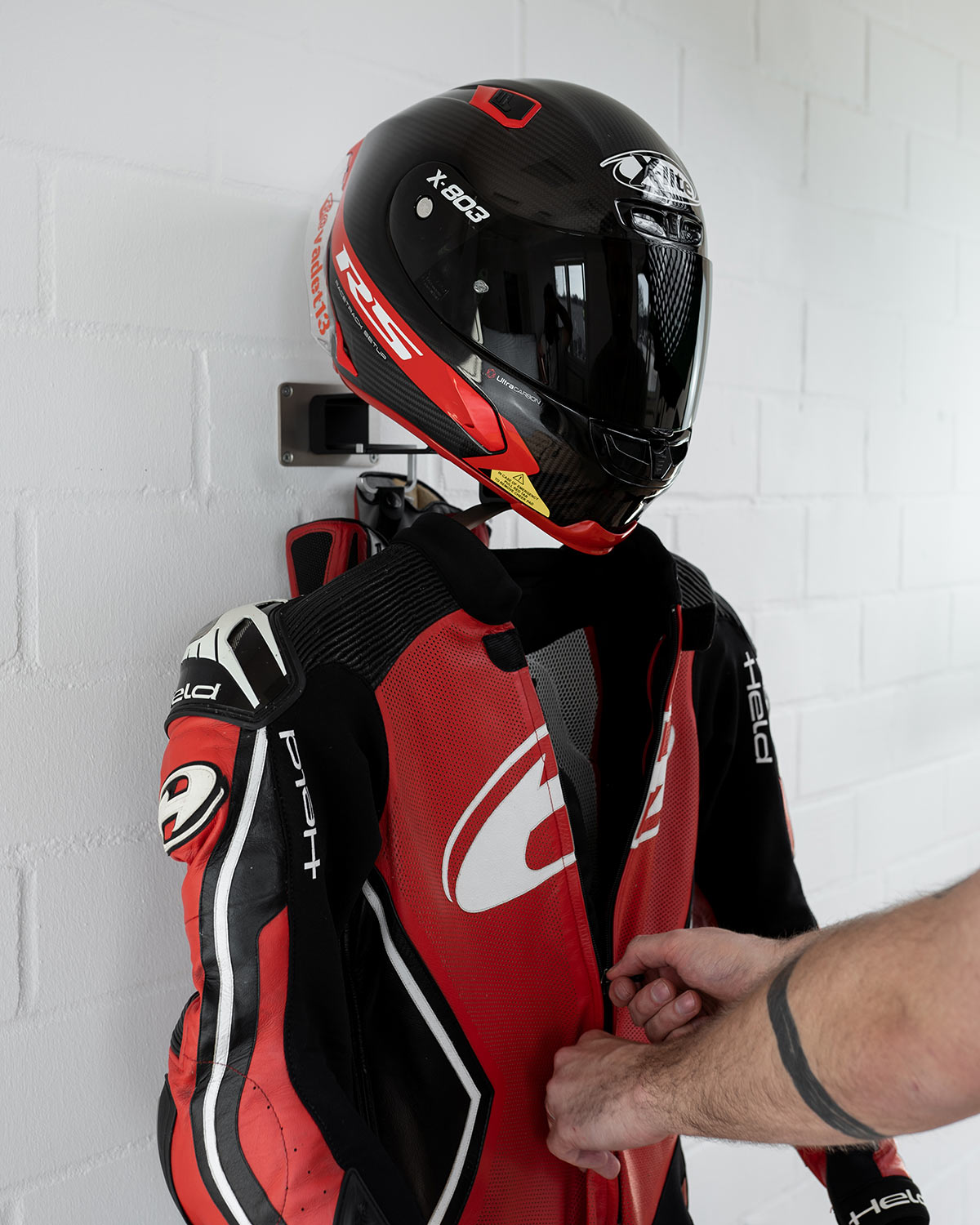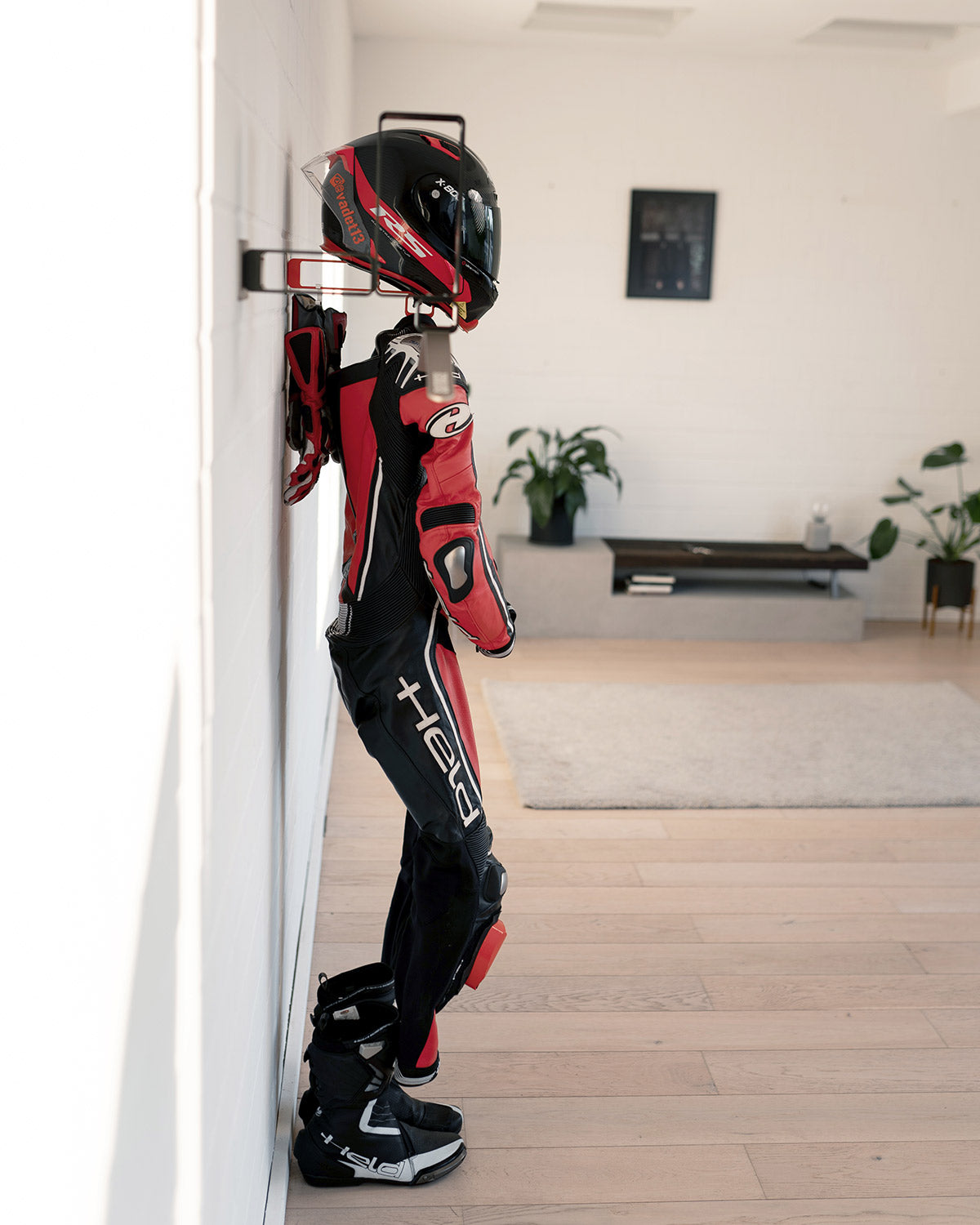 Natürlich wurde darauf geachtet, dass genug Abstand zur Wand besteht, um Schmutz zu vermeiden und auch Helme mit Spoiler sorgenfrei zu verwenden. Der freie Raum bietet Platz für Handschuhe, die 2-Teiler Hose oder anderen Accessoires.