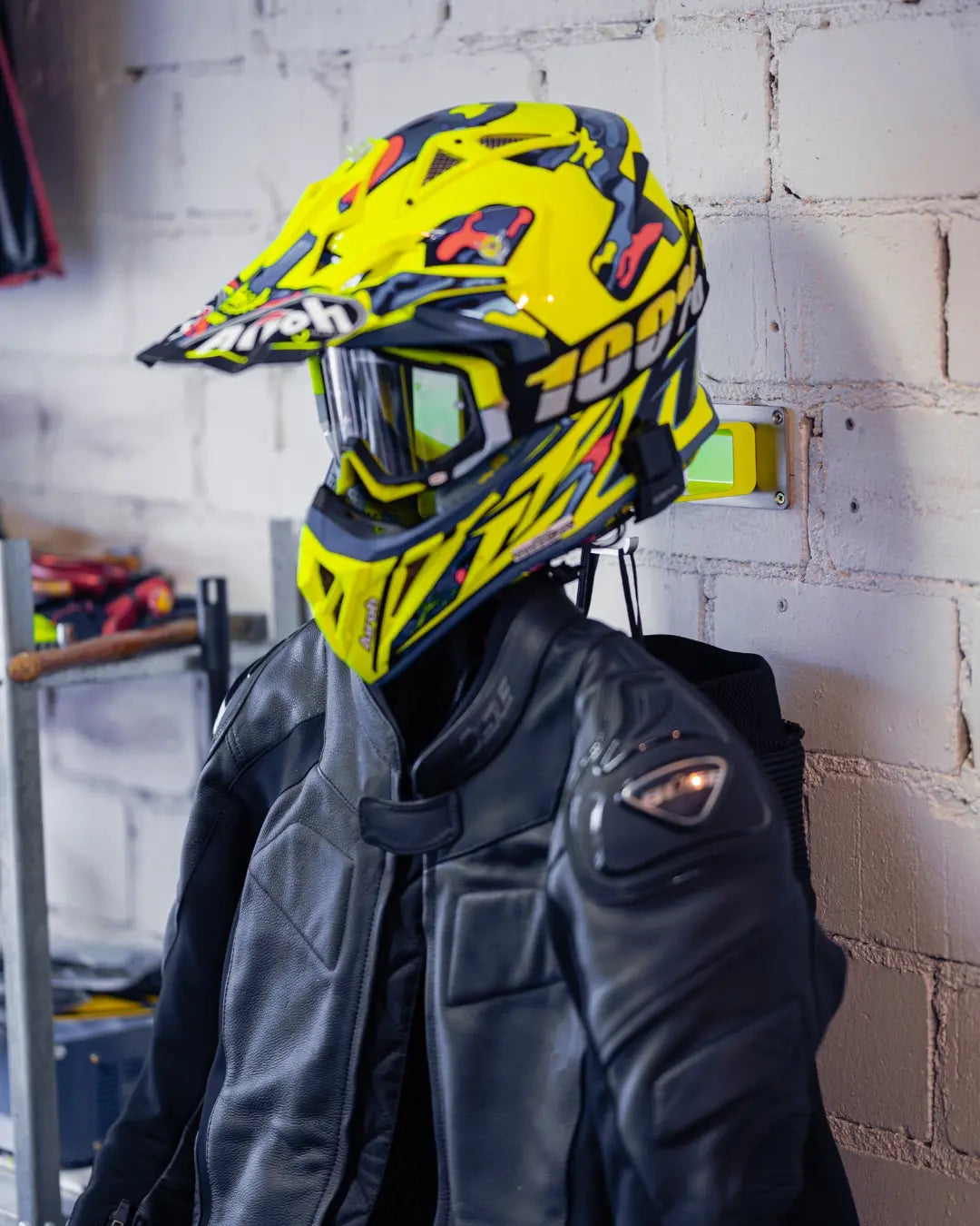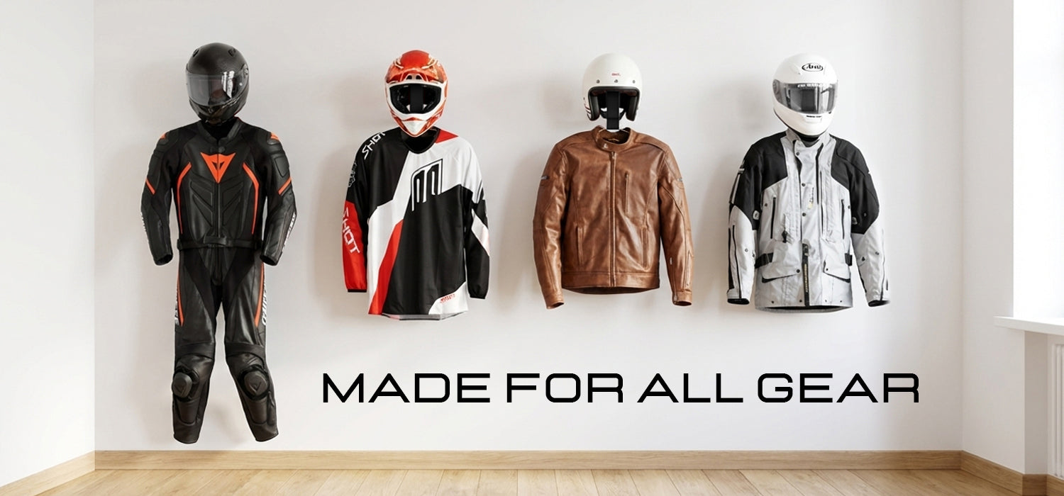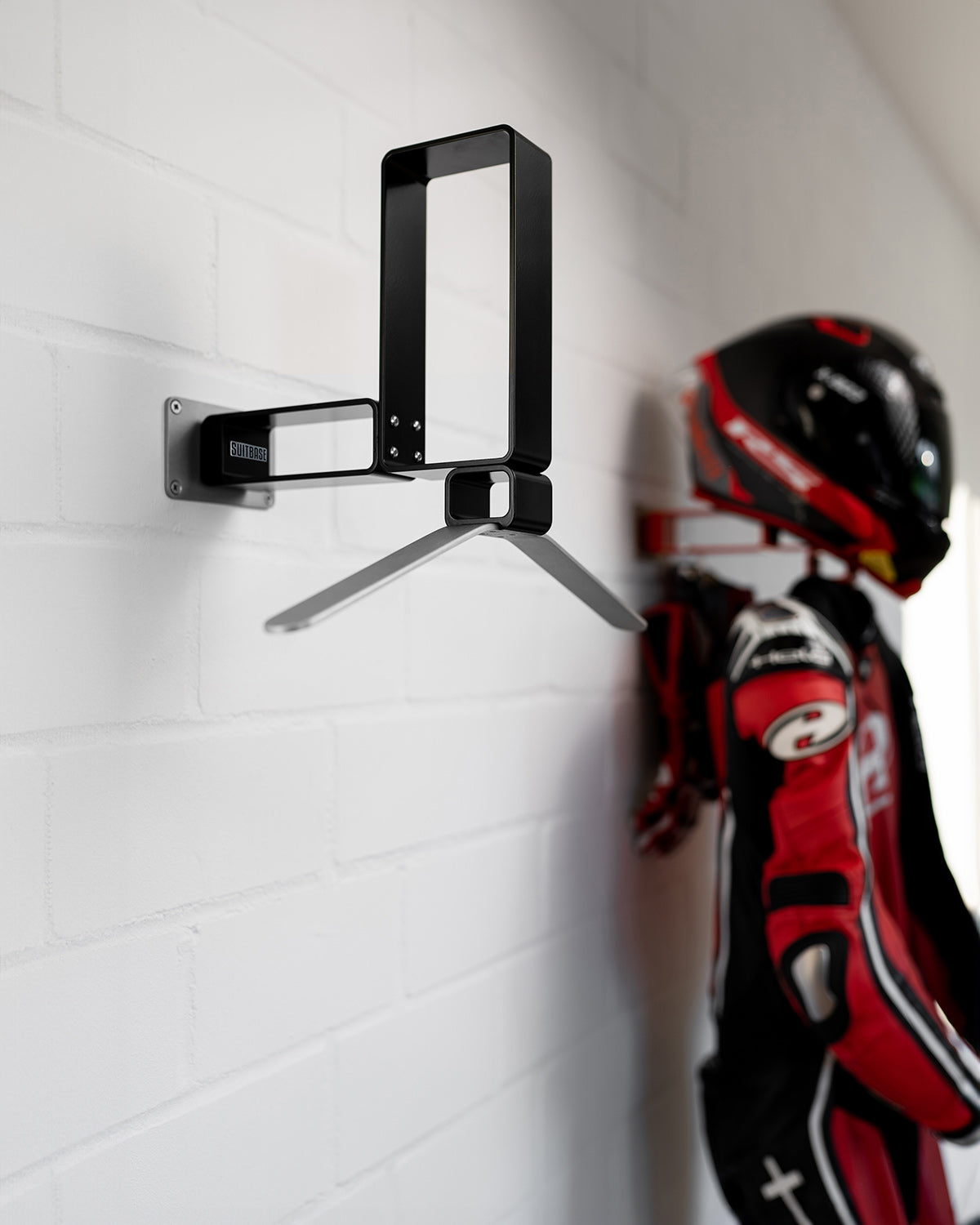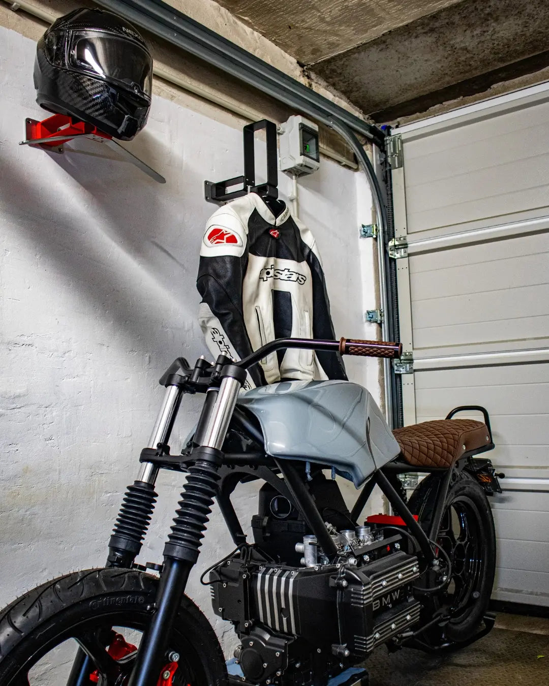Natürlich wurde darauf geachtet, dass genug Abstand zur Wand besteht, um Schmutz zu vermeiden und auch Helme mit Spoiler sorgenfrei zu verwenden. Der freie Raum bietet Platz für Handschuhe, die 2-Teiler Hose oder anderen Accessoires.